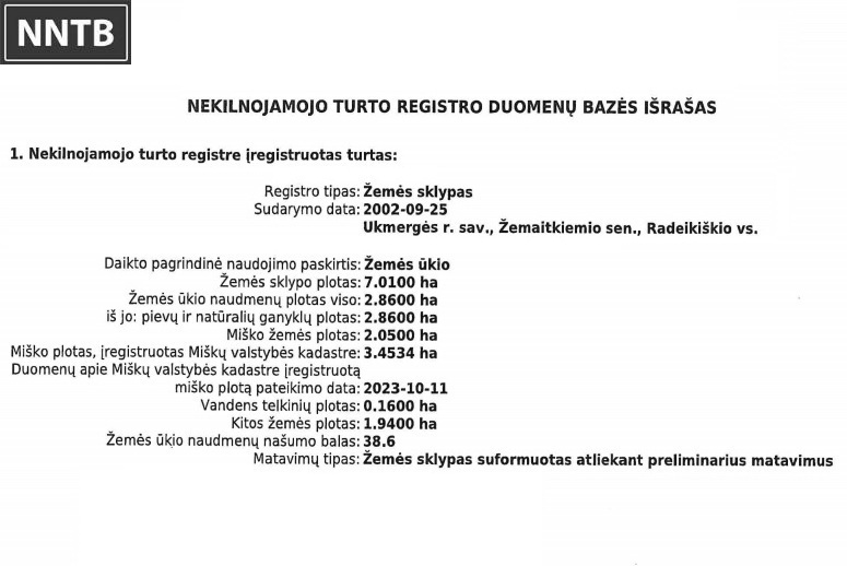 - Paskirtis: žemės ūkio paskirties sklypas, dalis teritorijos priskirta miškui;